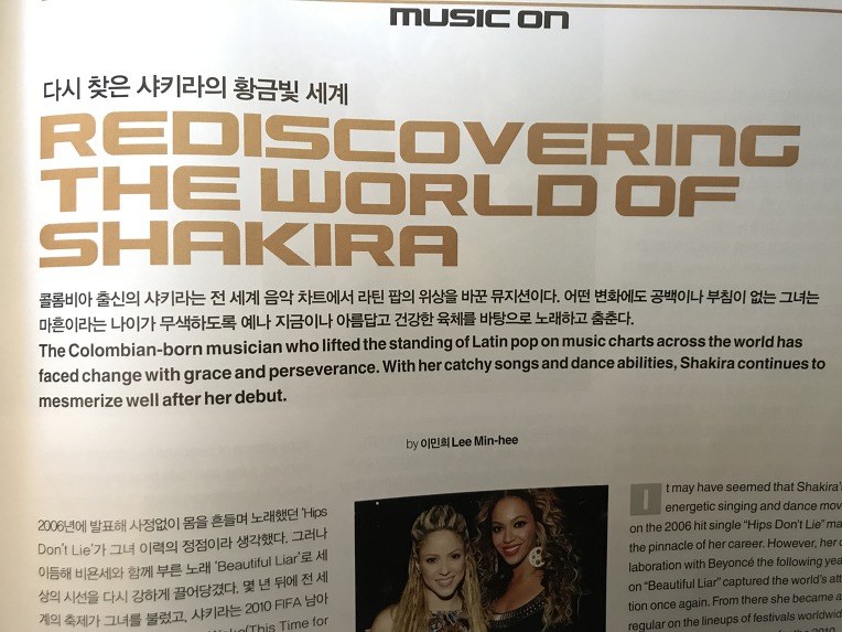 영문: The Columbian-born musician who lifted the standing of Latin pop on music charts across the world has faced change with grace and perseverance. With her cathcy songs and dance abilities, Shakira continues to mesmerize well after her debut.